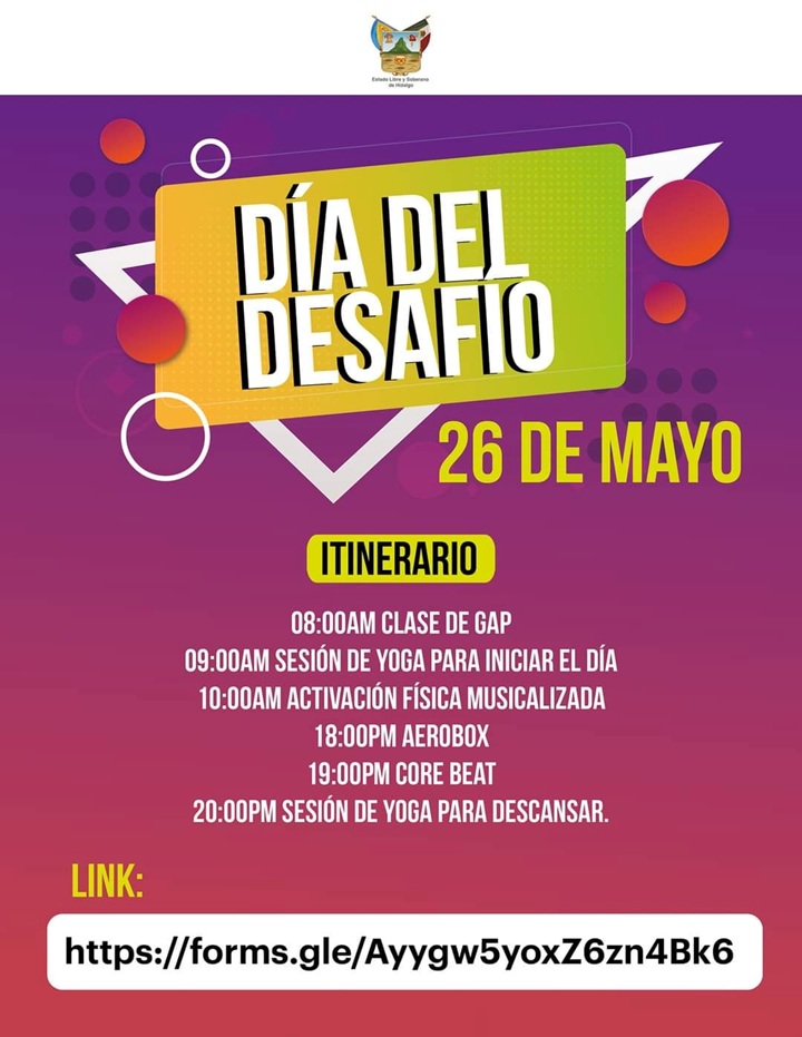 “Día del desafío” será transmitido de manera virtual a través de la página oficial de Facebook de Deporte Hidalgo, dando inicio a las actividades en punto de las 8:00 horas.