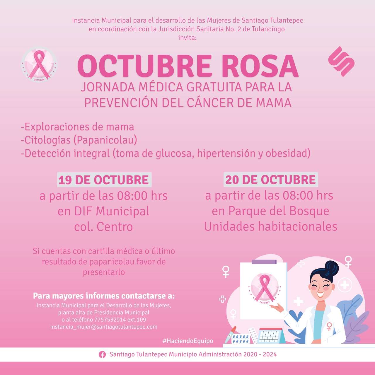 Santiago Tulantepec.- Con el objetivo de impulsar una cultura de salud entre la población santiaguense y en el marco de octubre rosa, reconocido como el mes de la lucha contra el cáncer de mama, la administración local 2020-2024 de Santiago Tulantepec a través de la Instancia Municipal para el Desarrollo de la Mujer invita a participar en la jornada médica relación a este tema.
