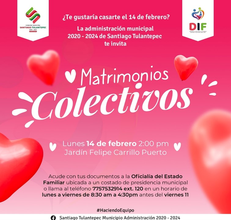 La administración municipal 2020-2024 de Santiago Tulantepec en coordinación con la Oficialía del Estado Familiar y Sistema DIF municipal invitan a la población santiaguense a participar en los Matrimonios colectivos el próximo 14 de febrero.
