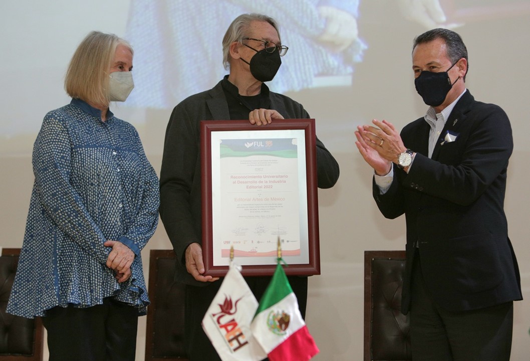 Pachuca, Hgo. – Por contribuir en la promoción de las ideas libres e independientes, del conocimiento y la cultura a lo largo de casi 34 años, la Universidad Autónoma del Estado de Hidalgo (UAEH) le entregó el Reconocimiento Universitario al Desarrollo de la Industria Editorial 2022 a Artes de México, en el marco de las actividades de Feria Universitaria del Libro (FUL), en su edición número 35.