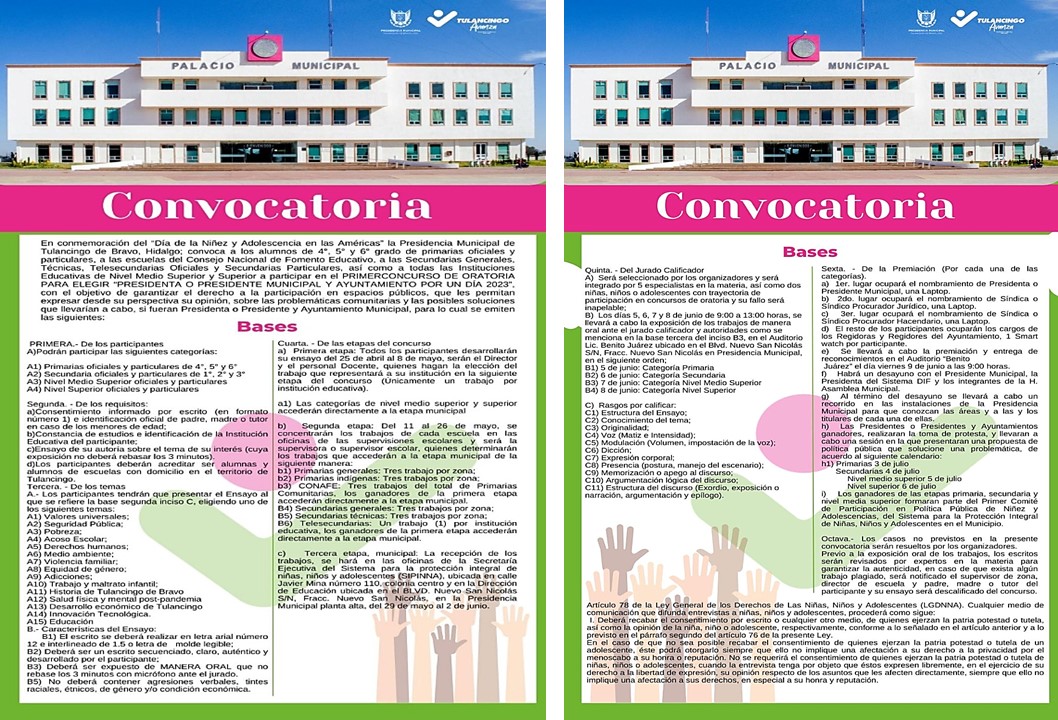 Tulancingo, Hgo.-Se emitió la convocatoria del Primer Concurso de Oratoria para elegir “Presidenta o Presidente Municipal y Ayuntamiento por un día 2023”, por parte del gobierno municipal de Tulancingo.