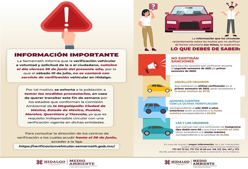 Es por ello que la Secretaría de Medio Ambiente y Recursos Naturales de Hidalgo (Semarnath) invita a la población en general a no caer en información falsa respecto a las sanciones aplicables; ya que, solo serán acreedores a multas las y los usuarios que realizaron su verificación vehicular por última ocasión durante el primer semestre de 2021.