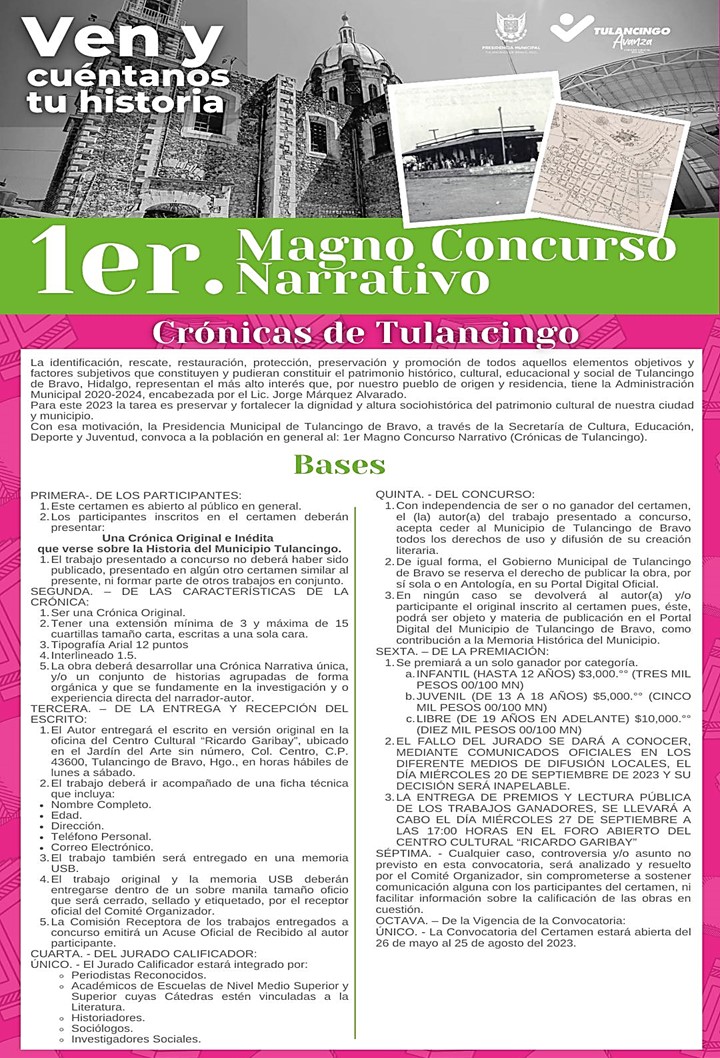Con tres categorías, la presidencia municipal a través de la Secretaría de Cultura, Educación, Deporte y Juventud impulsa que Tulancinguenses incursionen y exploren tanto su imaginación y creatividad en el primer concurso de Crónicas de Tulancingo.