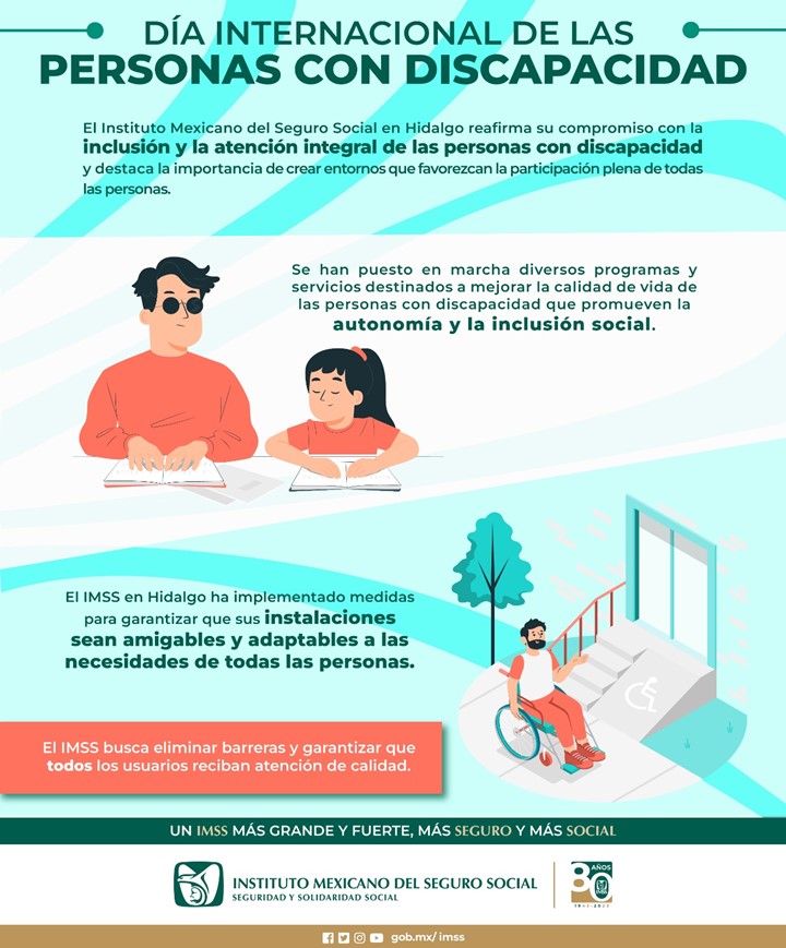 Pachuca, Hgo.-En conmemoración al Día Internacional de las Personas con Discapacidad, el Instituto Mexicano del Seguro Social (IMSS) en Hidalgo reafirma su compromiso con la inclusión y la atención integral de las personas con discapacidad y destaca la importancia de crear entornos que favorezcan la participación plena de todas las personas.
