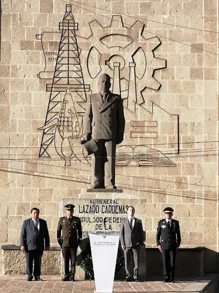 Pachuca, Hgo.-Con motivo del 86 aniversario de la Expropiación Petrolera en México, se realizó en Pachuca de Soto, el acto conmemorativo para recordar la nacionalización de la industria petrolera del país, decreto que se expidió el 18 de marzo de 1938. A pies del monumento dedicado al general Lázaro Cárdenas del Río, promotor de este acto histórico, se rindió honores a los Símbolos Patrios y colocó la respectiva ofrenda floral, como parte de las actividades correspondientes al lunes cívico.