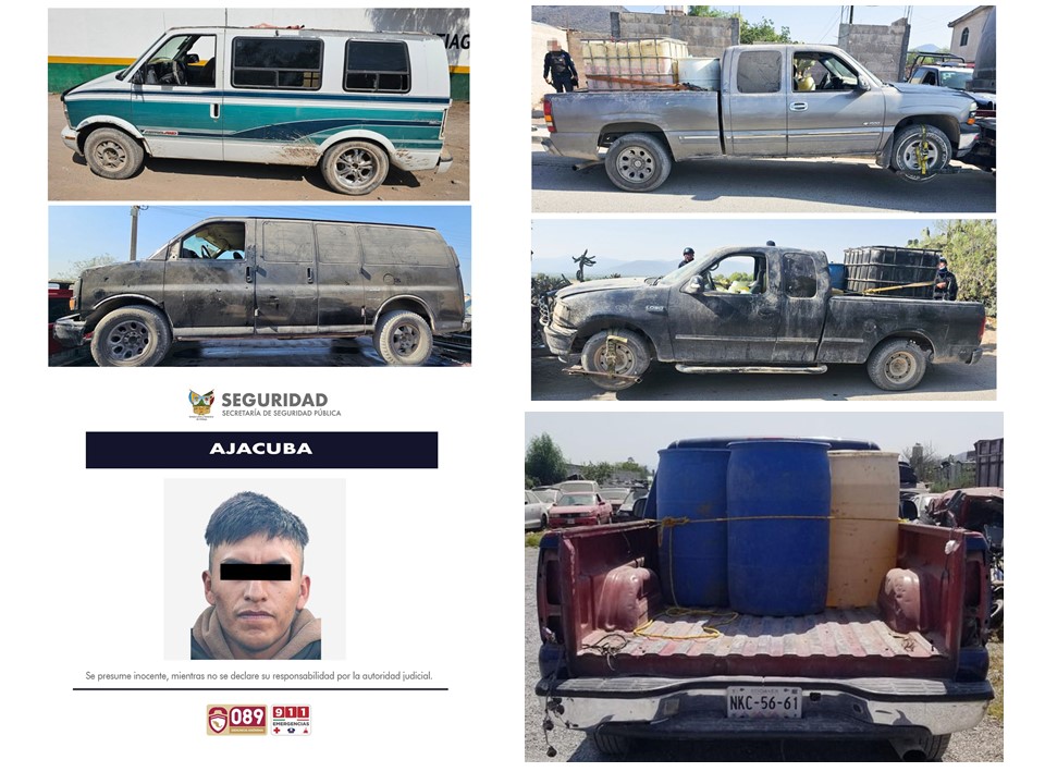 Dichos patrullajes permitieron la detención de un hombre con iniciales E. M. J., a bordo de una camioneta Chevrolet Astro, en cuyo interior se hallaban dos contenedores con capacidad de mil litros y un garrafón de 50 litros. Durante la revisión, se detectó que se trataba de trasiego ilegal de combustible y de un vehículo robado, por lo que quedó bajo resguardo de las autoridades.