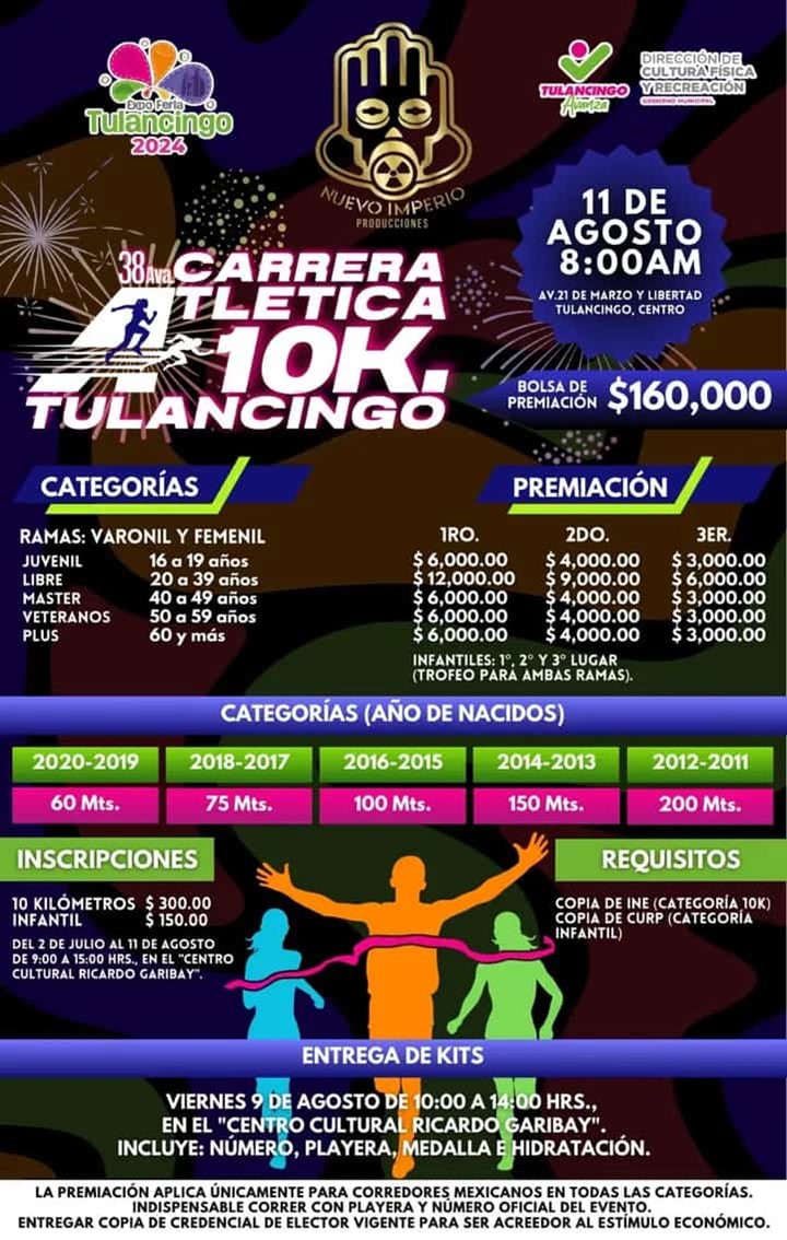 Tanto la carrera 10 k Tulancingo como la de rama infantil reunirá a corredores de todas las edades y niveles, en un evento lleno de emoción y convivencia culminando una ruta plana con salida y meta en la céntrica avenida 21 de marzo y libertad.