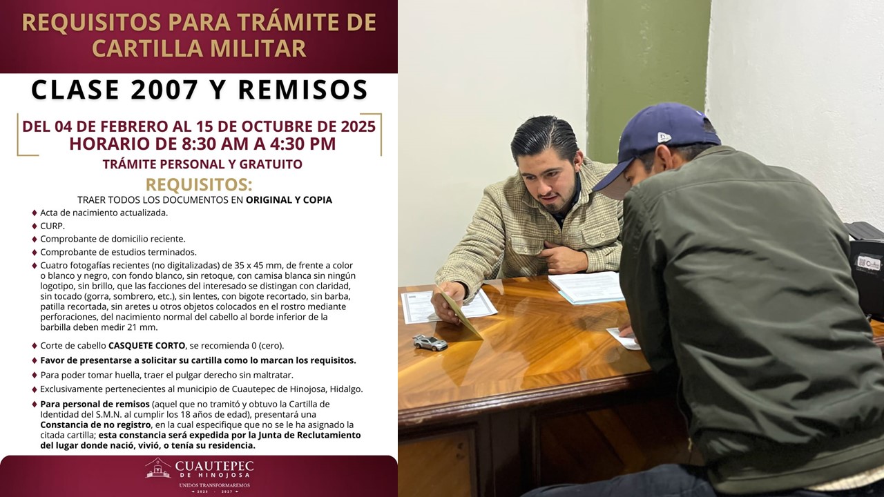 Cuautepec, Hgo.-La Junta Municipal de Reclutamiento llama a los jóvenes cuautepequenses de la clase 2007 y remisos a realizar el trámite de su Cartilla de Identidad del Servicio Militar Nacional.