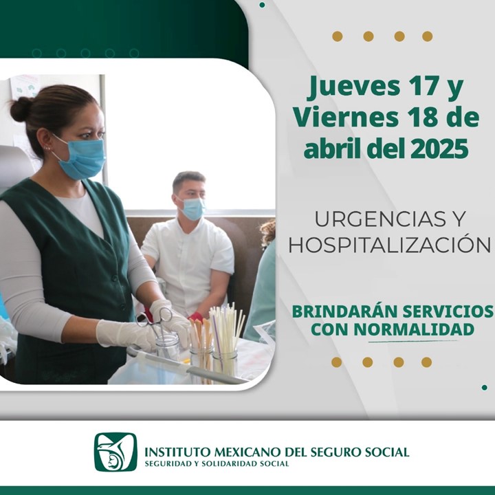 Pachuca, Hgo.-El Instituto Mexicano del Seguro Social (IMSS) en Hidalgo garantiza la continuidad de los servicios de Atención Médica Continua y Urgencias durante el periodo vacacional correspondiente al puente de Semana Santa, el 17 y 18 de abril.