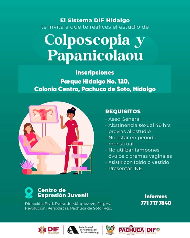 El Sistema DIF Hidalgo, a través del DIF Pachuca invita a las mujeres a realizarse los estudios de Papanicolaou y Colposcopia, de manera gratuita, como parte de su compromiso con la salud y la prevención del cáncer cervicouterino.