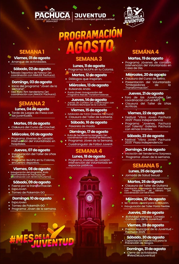 Las actividades se extenderán hasta el 31 de agosto con un cierre simbólico que marcará el final de este ciclo de participación, expresión y fortalecimiento juvenil en la capital hidalguense con la visión y respaldo del alcalde, Jorge Reyes.