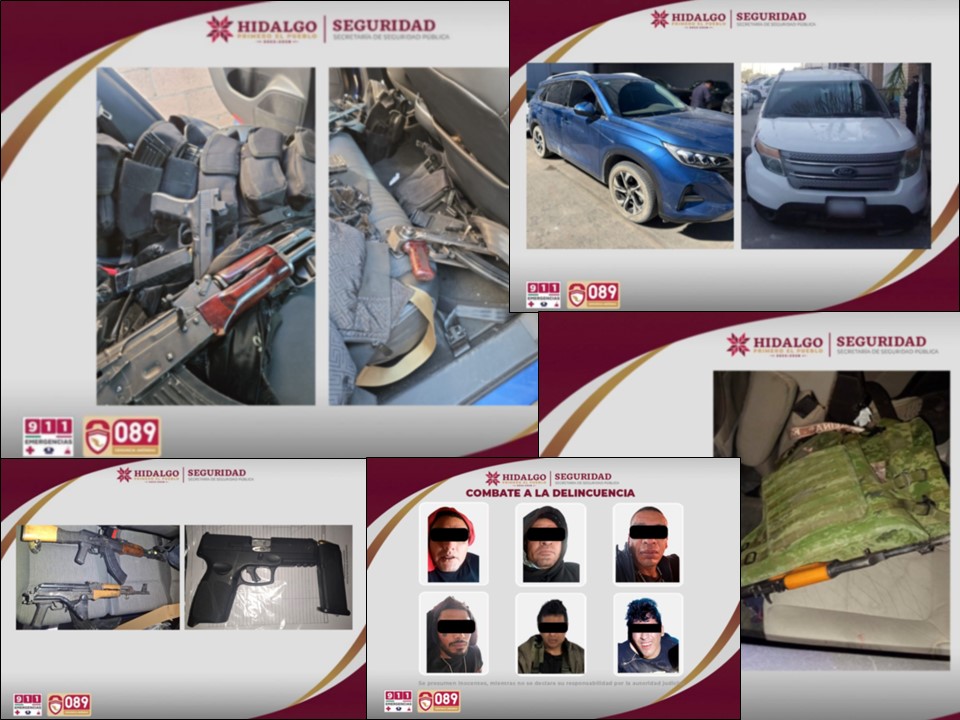 Como resultado del seguimiento, uno de los vehículos vinculados a la agresión fue localizado sobre la carretera Tula–Jorobas, donde se registró un enfrentamiento armado. Durante la intervención, fueron asegurados dos sujetos que viajaban a bordo de una camioneta Explorer blanca, ambos originarios del estado de Campeche.