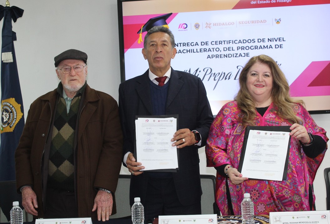 La entrega de estos documentos estuvo presidida por Francisco Martínez Gómez, titular de la Policía Bancaria; Francisco Patiño Cardona director del Consejo de Ciencia, Tecnología e Innovación de Hidalgo (CITNOVA), y Roxana Mendoza Albores, directora de Mi Prepa Digital.