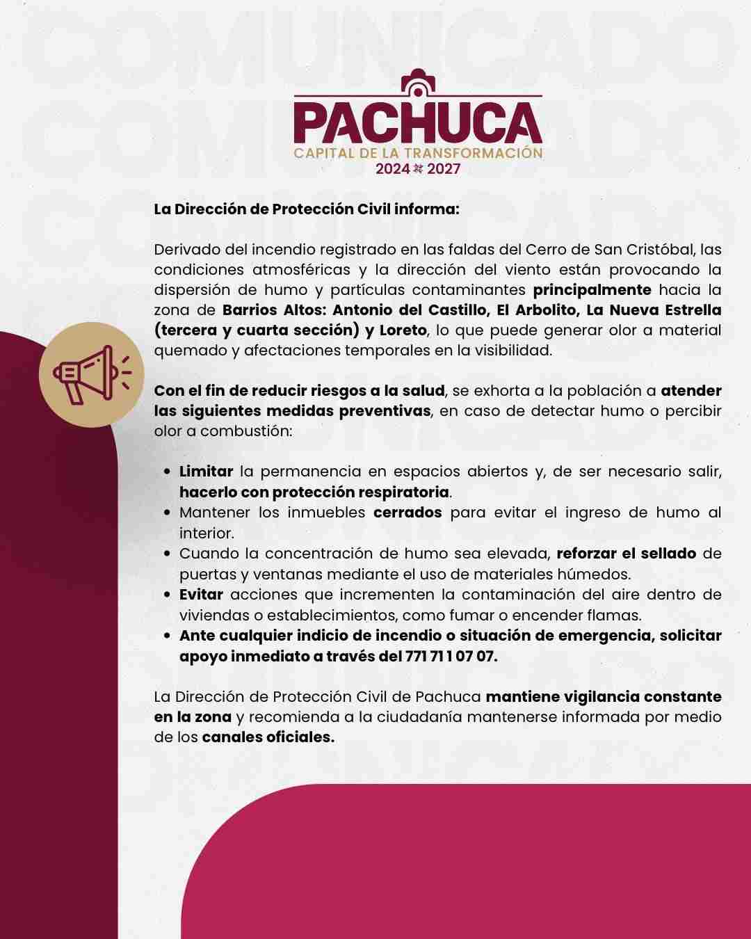 La Dirección de Protección Civil de Pachuca informó que, derivado del incendio registrado en las faldas del Cerro de San Cristóbal, las condiciones atmosféricas y la dirección del viento han provocado la dispersión de humo y partículas contaminantes, principalmente hacia la zona de Barrios Altos.