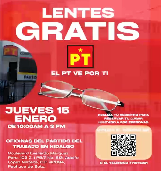 Pachuca, Hgo.— Con el objetivo de contribuir al bienestar y la salud visual de la ciudadanía, el Partido del Trabajo en Hidalgo llevará a cabo una jornada de entrega de lentes totalmente gratuitos, dirigida a la población que lo requiera.