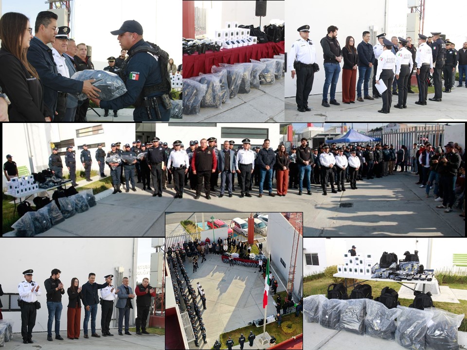 En su intervención, el titular de la Secretaría de Seguridad Ciudadana, Jorge Alberto Trejo Terrazas, informó que se entregaron fornituras, chalecos tácticos, cámaras de solapa, mochilas tácticas, chalecos balísticos, cascos balísticos, goggles tácticos, juegos de coderas, juegos de rodilleras, candados de mano, bastón policial PR–24 y lámparas de mano, para 280 elementos.