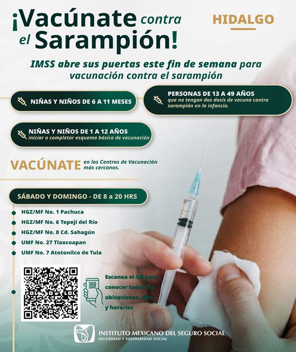 El IMSS en Hidalgo destaca que la vacunación es la herramienta más eficaz para cortar cadenas de transmisión y proteger a la población ante una enfermedad altamente contagiosa como el sarampión, por lo que exhorta a madres, padres y tutores a verificar el esquema de sus hijas e hijos.