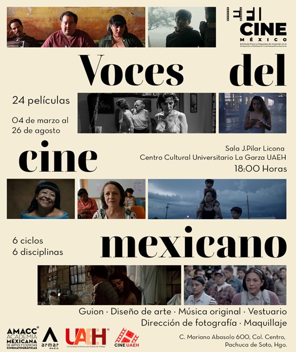 Pachuca, Hgo. – Como parte de las acciones del programa de extensión de la cultura, dará inicio en la Universidad Autónoma del Estado de Hidalgo (UAEH) CINE UAEH, proyecto que ofrecerá funciones abiertas a todo público de marzo a agosto del presente año. En el marco de esta iniciativa, se presentará la muestra Voces del Cine Mexicano de la Academia Mexicana de Artes y Ciencias Cinematográficas (AMACC).