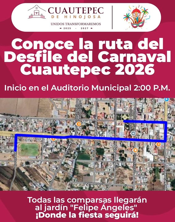 Las comparsas iniciarán su recorrido desde el Auditorio Municipal, avanzando por Boulevard Francisco I. Madero, para continuar por la calle Miguel Hidalgo y posteriormente por Independencia, hasta llegar al jardín “Felipe Ángeles”, donde la fiesta continuará con todo el ambiente del carnaval.