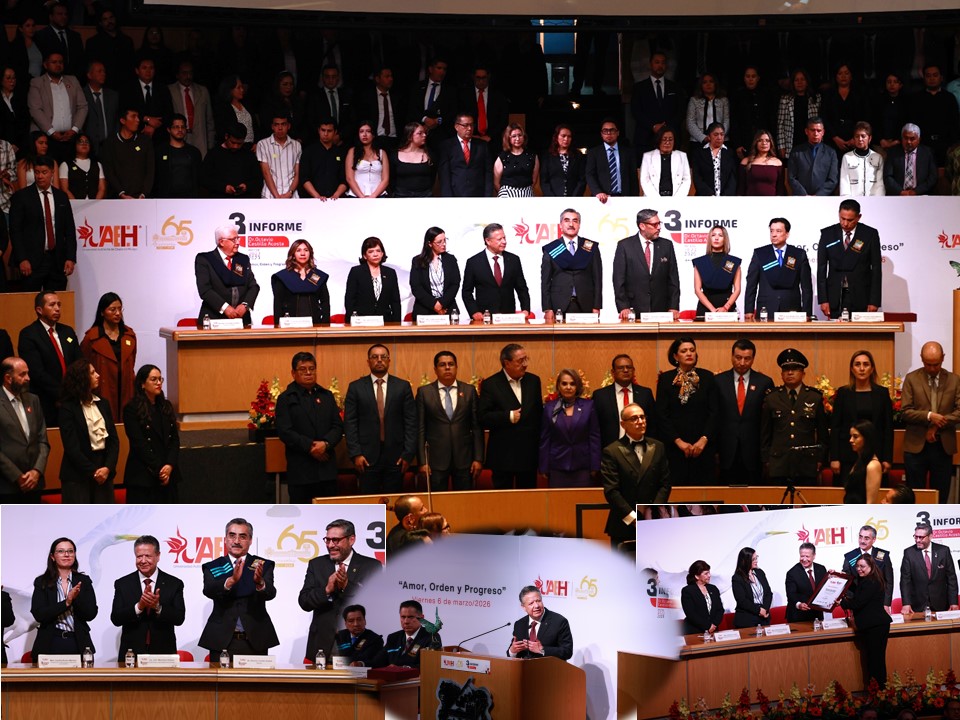 Pachuca, Hgo.-El gobernador Julio Menchaca Salazar atestiguó el tercer informe de la actual administración de la Universidad Autónoma del Estado de Hidalgo (UAEH), encabezada por el rector Octavio Castillo Acosta, donde reiteró el compromiso del gobierno estatal con el fortalecimiento de la educación como eje de transformación en la entidad.