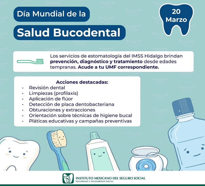 Pachuca, Hgo.-En el marco del Día Mundial de la Salud Bucodental, que se conmemora el 20 de marzo, el Instituto Mexicano del Seguro Social (IMSS) en Hidalgo fortalece sus acciones de promoción, prevención y atención oportuna para mejorar la salud bucodental de la población derechohabiente.