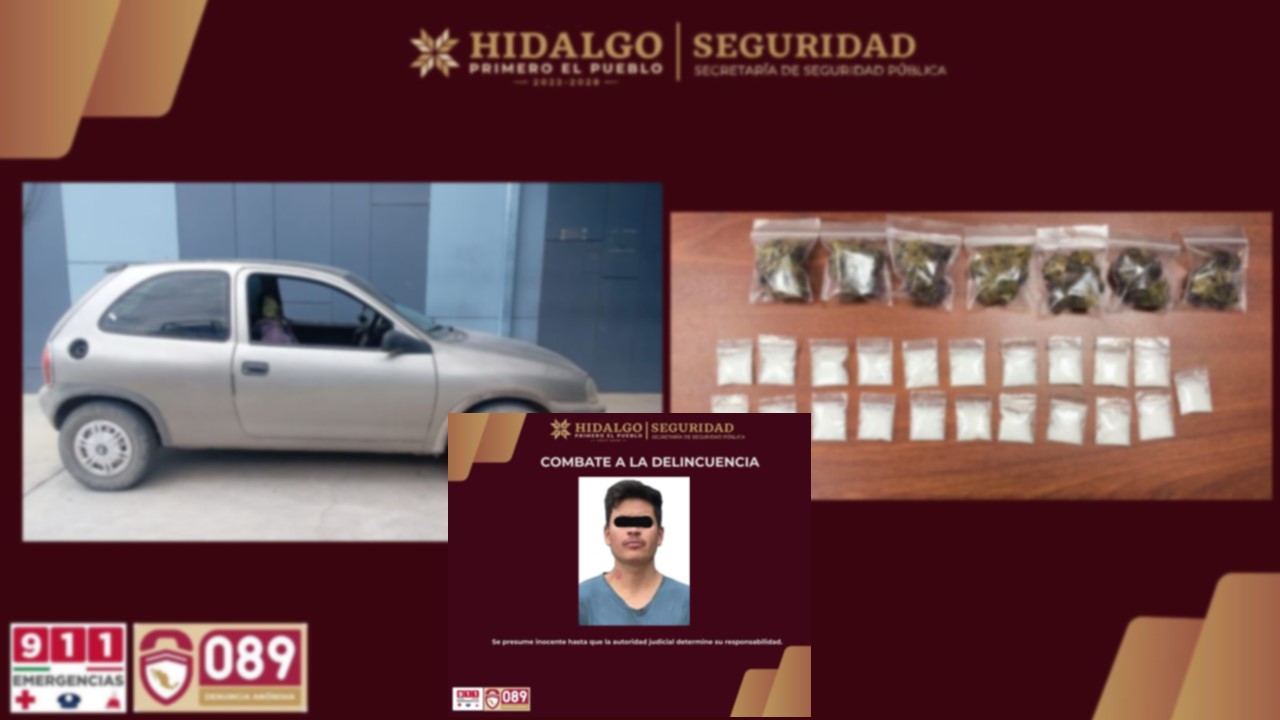 Al sujeto, un hombre de 24 años, le fueron encontradas 28 dosis de presunta droga, entre marihuana y cristal, por lo que fue puesto a disposición de la autoridad ministerial junto con el vehículo asegurado, para el desarrollo de las investigaciones correspondientes.