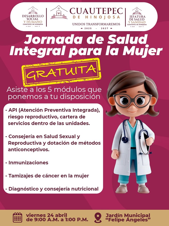 Como parte de las acciones encaminadas a fortalecer la prevención y el cuidado de la salud en el municipio, el gobierno de Cuautepec de Hinojosa, a través de la dirección de Desarrollo Social y Humano y la jefatura de Salud y Sanidad, invita a la ciudadanía a participar en la Jornada de Salud Integral para la Mujer.