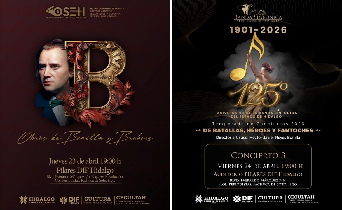 Pachuca, Hgo.-La Orquesta Sinfónica del Estado de Hidalgo (OSEH) y la Banda Sinfónica del Estado de Hidalgo ofrecerán dos conciertos consecutivos los días 23 y 24 de abril a las 19:00 horas en Pilares DIF Hidalgo, como parte de sus temporadas artísticas.