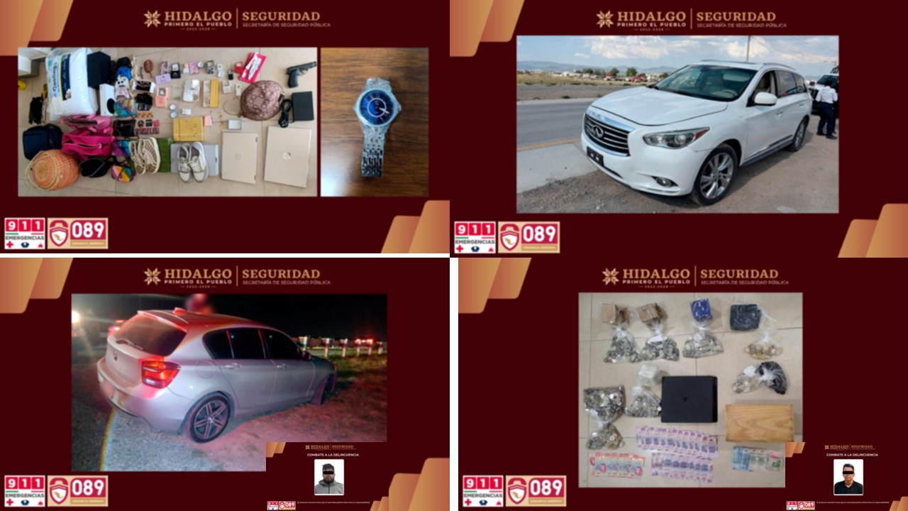 Mediante el seguimiento en tiempo real, se logró ubicar el vehículo relacionado mientras circulaba sobre la carretera México–Pachuca, a la altura del municipio de Tolcayuca. Al notar la presencia policial, el conductor intentó huir a pie, siendo alcanzado y asegurado. Asimismo, se localizaron las joyas sustraídas, dos equipos de cómputo portátil y diversos objetos.