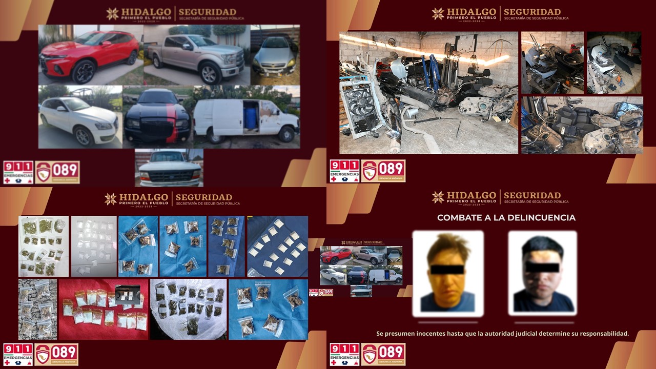 Pachuca, Hgo.-La Secretaría de Seguridad Pública de Hidalgo (SSPH) encabezó un operativo en la colonia Francisco Villa, municipio de Cuautepec de Hinojosa, donde se logró el aseguramiento de dos hombres, 120 piezas de autopartes robadas, 758 dosis de presunta droga y siete vehículos, varios de ellos con irregularidades y reporte de robo, tras la ubicación de cuatro inmuebles presuntamente vinculados con actividades delictivas.