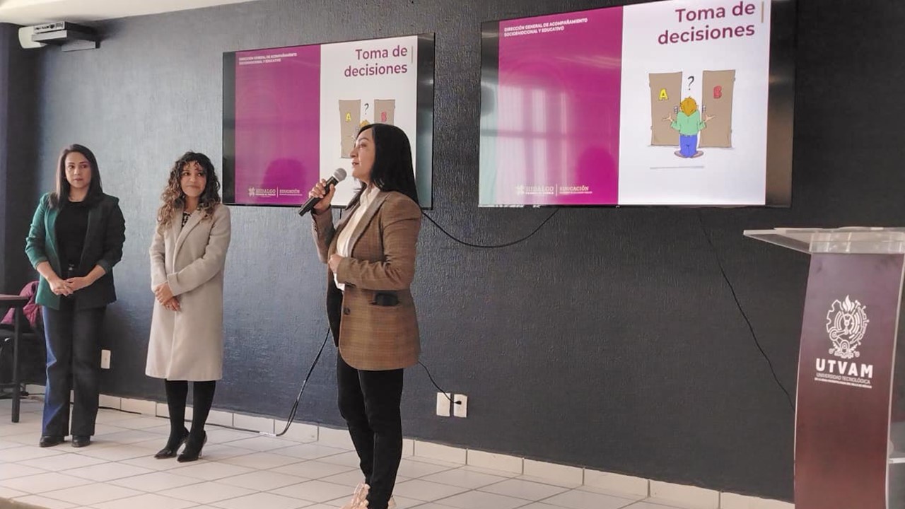 La actividad contó con la participación de especialistas de la Dirección General de Acompañamiento Socioemocional y Educativo de la Secretaría de Educación Pública de Hidalgo (SEPH), quienes impartieron las ponencias “Toma de decisiones” y “Persistencia”, con el objetivo de fomentar la reflexión en torno a la toma de decisiones conscientes y el desarrollo de la resiliencia ante los retos de la vida académica.
